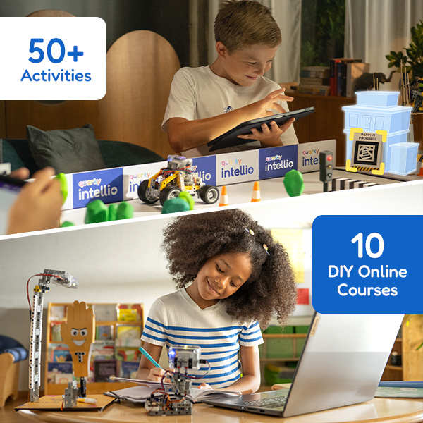 Quarky Intellio includes high fidelity sensors viz – camera and microphone fora strong focus on AI, computer vision, and AR-based DIY learning. Essentially, Intellio is like an upgraded version of Quarky that provides learners the evolved ability of AI-centric innovation in their robot designs. Intellio combined with Quarky increases its capabilities multifold.