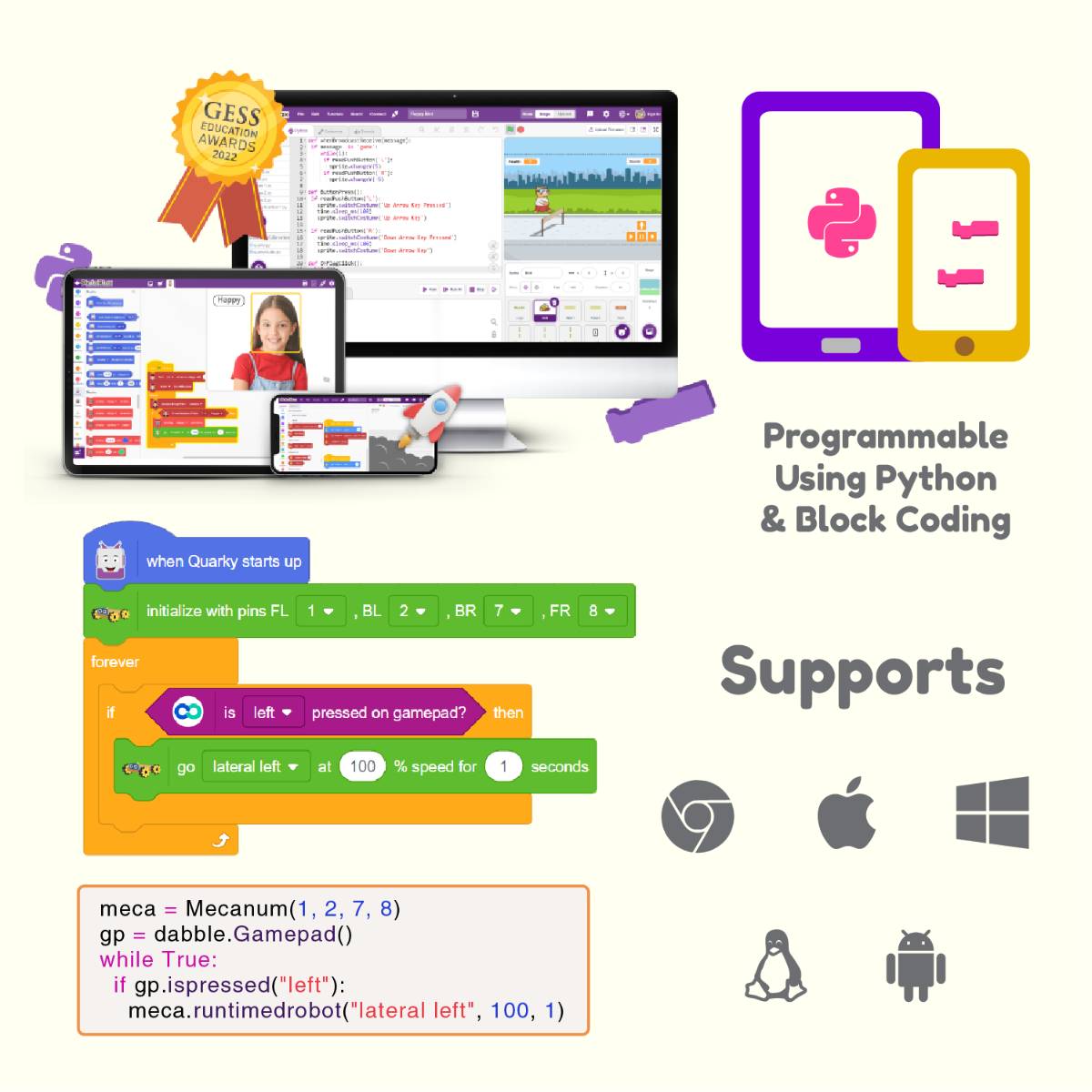 PictoBlox lets you code the Quarky Mecanum Robot using Python. Python is currently available on Windows, MacOS, Linux, and the web version only. It’s not yet available on smartphones, but it will be coming soon.